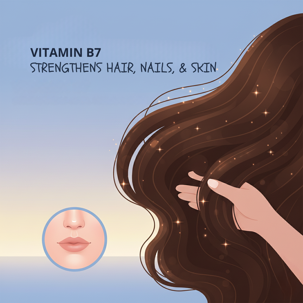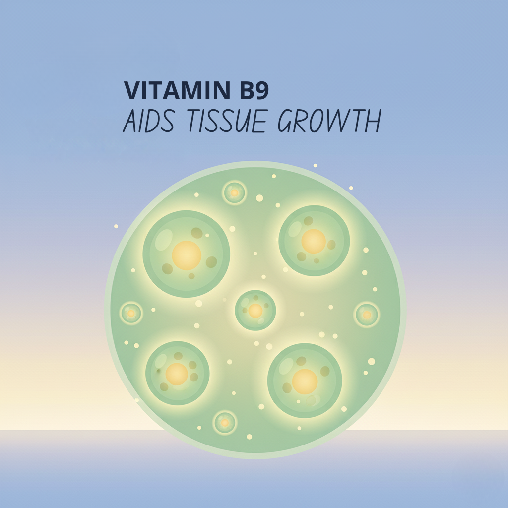 Vitamin B9 (folate) nourishes the development and upkeep of body tissues, helping maintain the strength and beauty of your hair, skin, and nails.